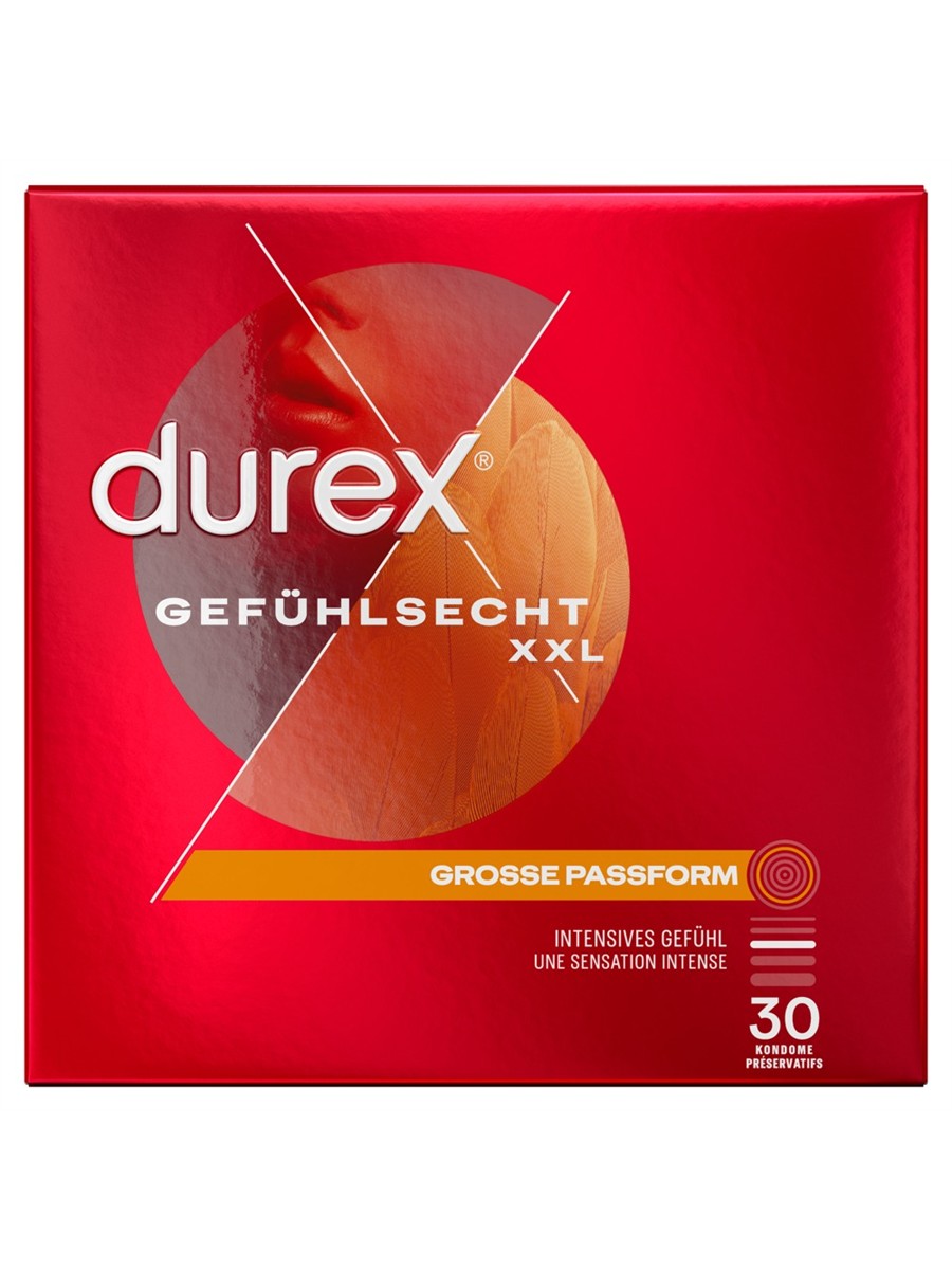 Die dünnen und transparenten Kondome Durex Gefühlsecht XXL aus Naturkautschuklatex sind mit die größten Kondome auf dem Markt. Maße: 220 mm lang (üblich sind 180 mm). Nominale Breite 60 mm (üblich sind 52 mm). Mit Feuchtbeschichtung auf Silikonbasis. Im Vergleich zu herkömmlichen zylindrischen Kondomen bietet die innovative anatomische Easy-on-Form der Durex-Kondome an den richtigen Stellen etwas mehr Platz und gewährleistet so ein leichteres Anlegen und Abrollen sowie komfortablen Sitz und intensives Empfinden.