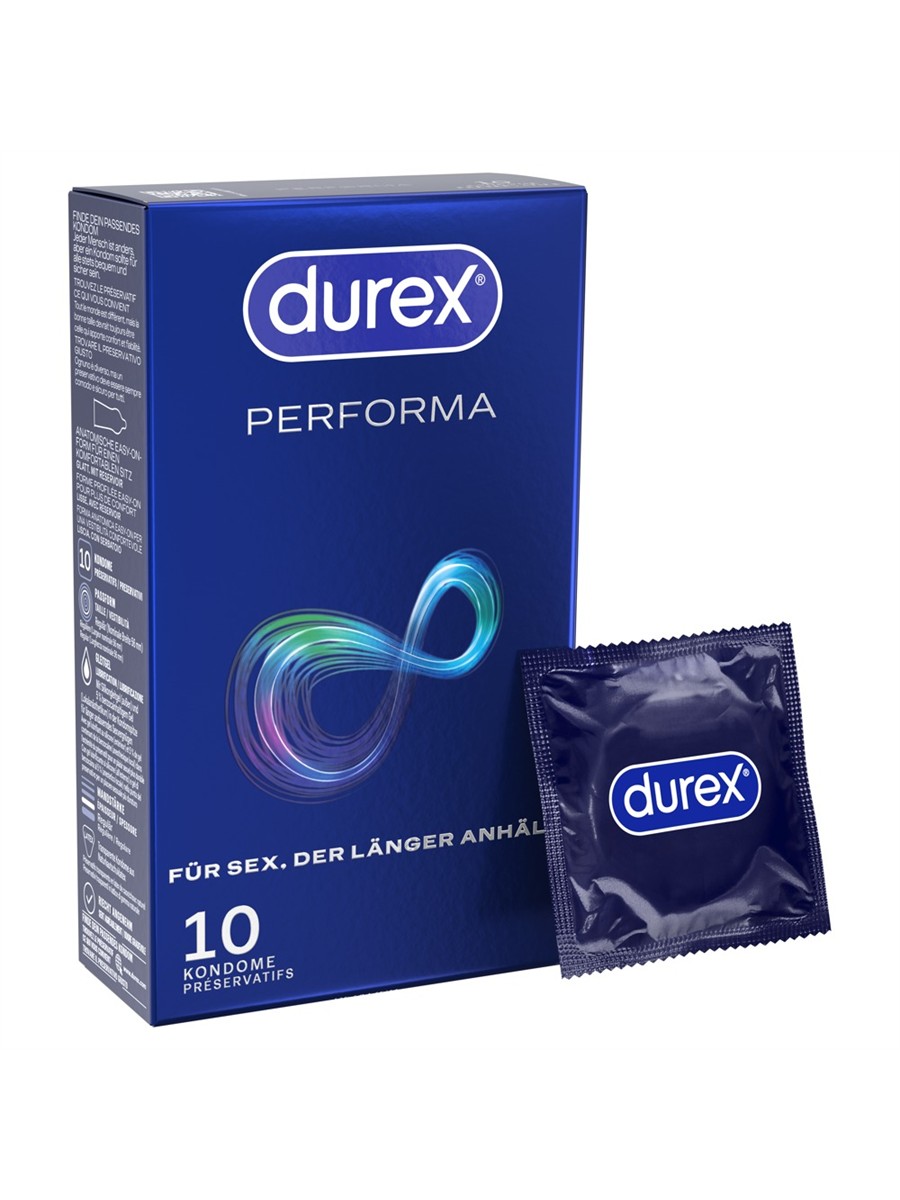 Transparente Kondome Performa von Durex mit 5 % benzocainhaltigem Gel in der Kondomspitze, das helfen kann, den Höhepunkt hinauszuzögern und die Erregungsphase zu verlängern. Mit Silikongleitgel befeuchtet. Die innovative anatomische Easy-on-Form bietet im Vergleich zu herkömmlichen zylindrischen Kondomen an den richtigen Stellen etwas mehr Platz  für leichteres Anlegen und Abrollen sowie komfortablen Sitz.