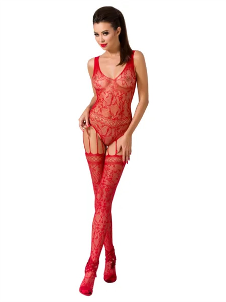 Dieses sinnliche Bodystocking verbindet ein elegantes Spitzenmuster mit integrierten Strapshaltern und zarten Strumpfelementen. Das elastische Material passt sich flie