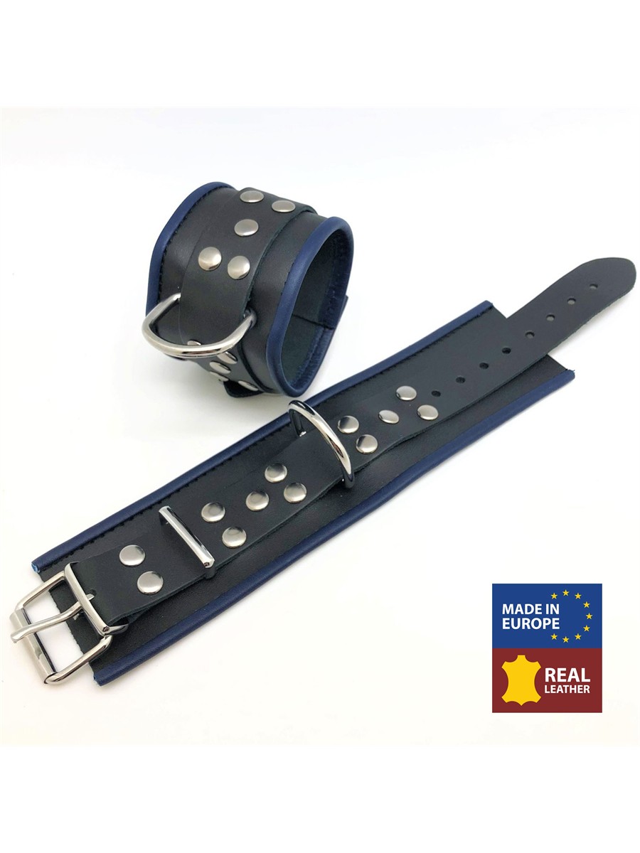 Diese robusten Fussfesseln aus Echtleder verbinden edles Design mit sicherem Halt und bieten dir ein intensives BDSM-Erlebnis. Schwarz mit intensivem blauen Rand verarbeitet, sitzen sie angenehm an den