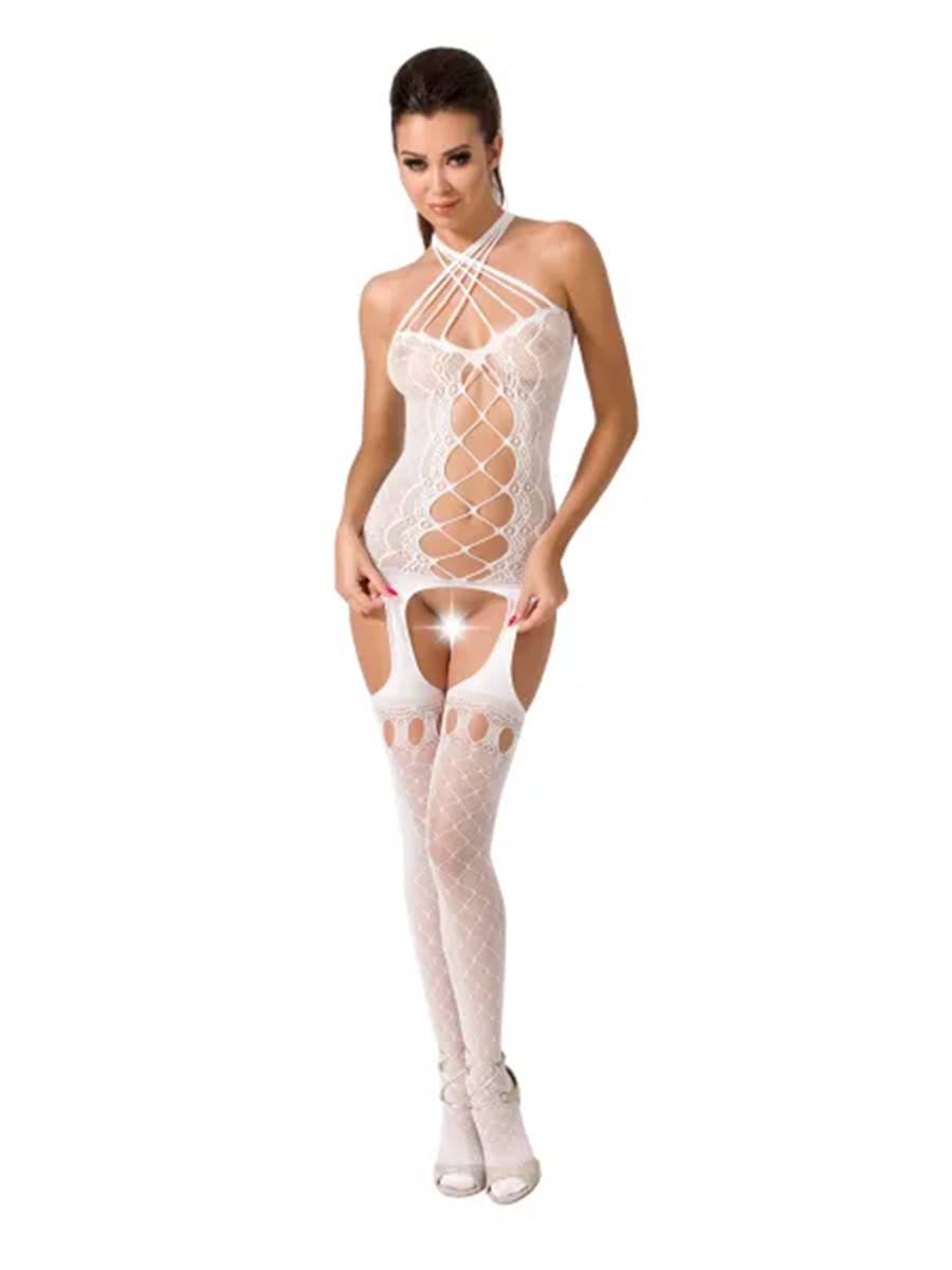 Ein körperbetonter, weißer Bodystocking mit dekorativen Cut-outs, überkreuzten Zierbändern am Dekolleté und integrierten Netzstrümpfen. Das elastische Material bietet eine flexible Passform in Universalgröße.