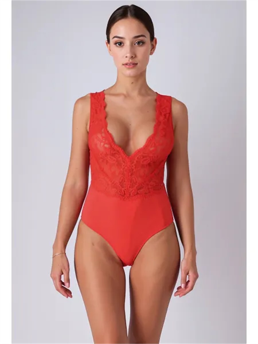 Ein eleganter roter Body mit tiefem V-Ausschnitt und fein gearbeiteter Spitze im Brustbereich. Die Kombination aus transparenten Spitzenpartien und glattem, elastischem Stoff sorgt f