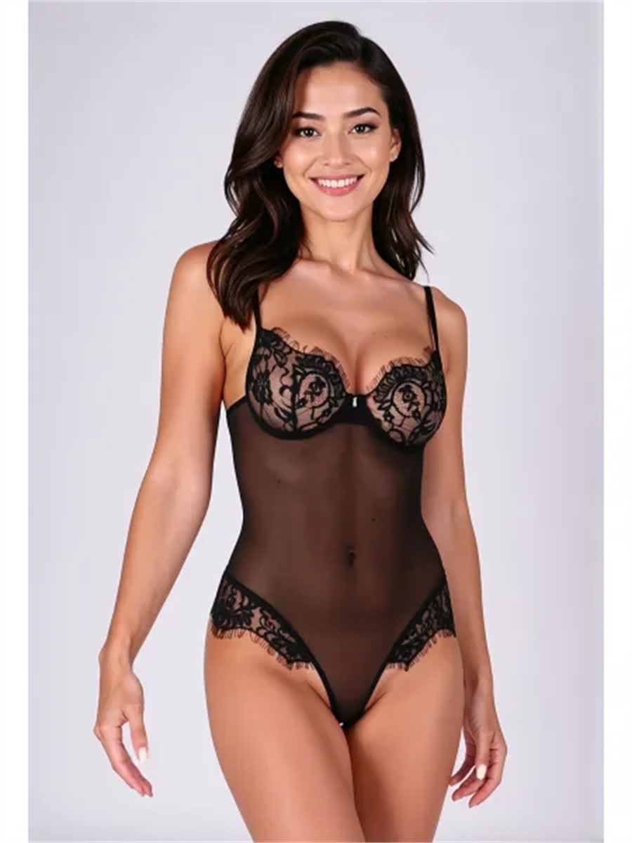 Ein transparenter Body aus feinem Mesh mit floraler Spitze und B