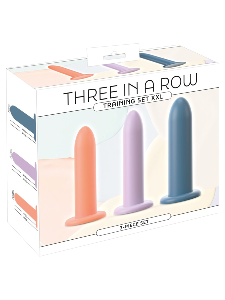 Training Set Three in a Row von You2Toys mit 3 massiven Silikon-Dildos in verschiedenen Pastellfarben, Größen und Gewichten. Die Dildos sind angenehm fest und gleichzeitig flexibel, wodurch sie vielseitig einsetzbar sind