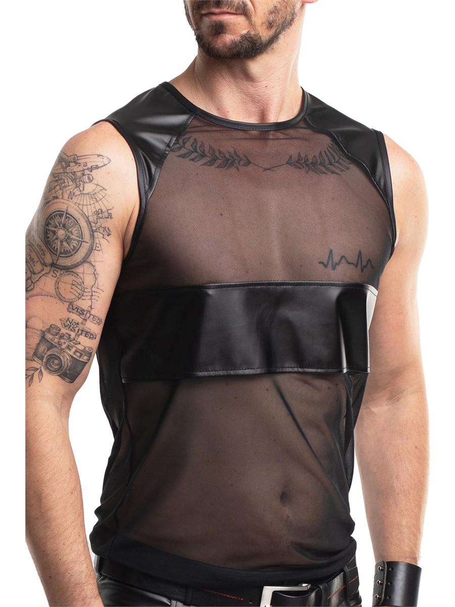 Dieses moderne Herrenhemd aus schwarzem Netzstoff betont bewusst die Körperform. Das transparente Material hebt Muskeln, Tattoos und Piercings hervor und sorgt für einen selbstbewussten, maskulinen Look. Schwarze Wetlook-Einsätze an Schultern und Brust setzen auffällige Akzente und betonen die Breite der Schultern sowie die Form der Arme und des Oberkörpers. Das Hemd fühlt sich angenehm auf der Haut an, ist elastisch und behält auch bei Bewegung seine Passform. Ideal zum Kombinieren mit den passenden Shorts RMNorberto001, wie auf den Bildern gezeigt.