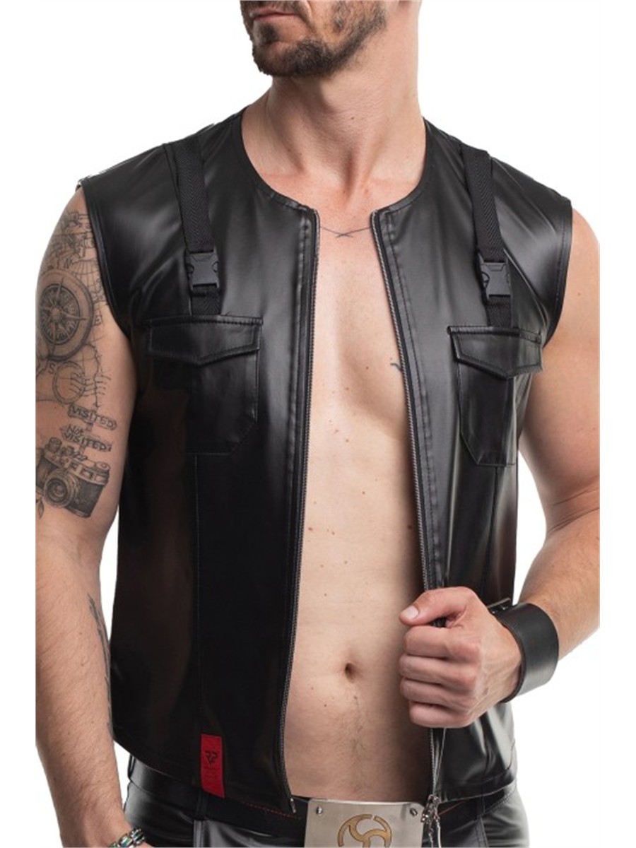 Moderne Herrenweste aus schwarzem, elastischem Wet-Look-Material mit körpernaher Slim-Fit-Passform. Die Weste ist mit einem durchgehenden Zwei-Wege-Reißverschluss, dekorativen Taschen und markanten Riemen-Details ausgestattet.