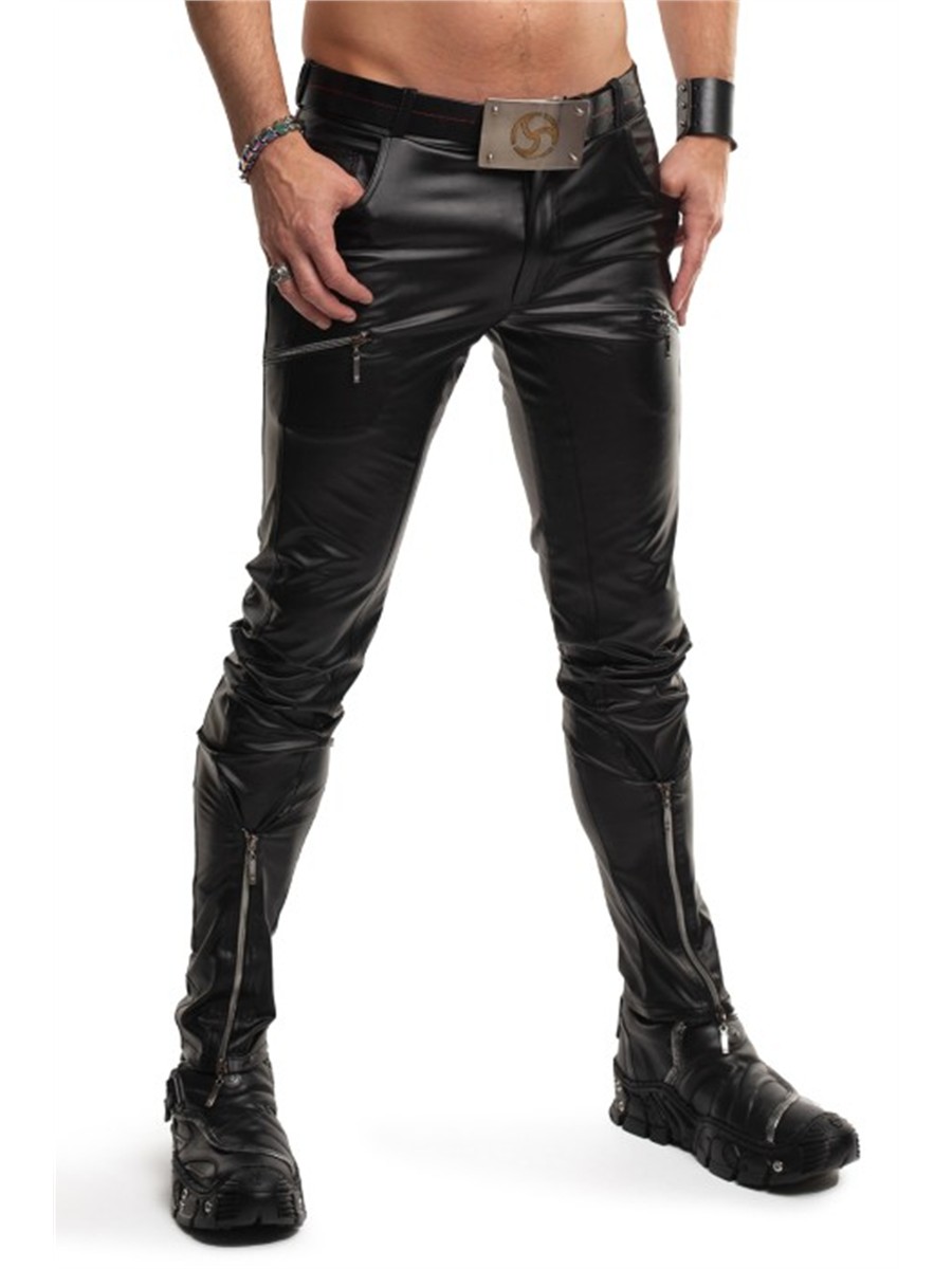 Auffällige Low-Waist-Herrenhose aus schwarzem, elastischem Wet-Look-Material mit markantem Design. Dekorative Reißverschlüsse und funktionale Details verleihen dem Modell eine kraftvolle, moderne Optik.