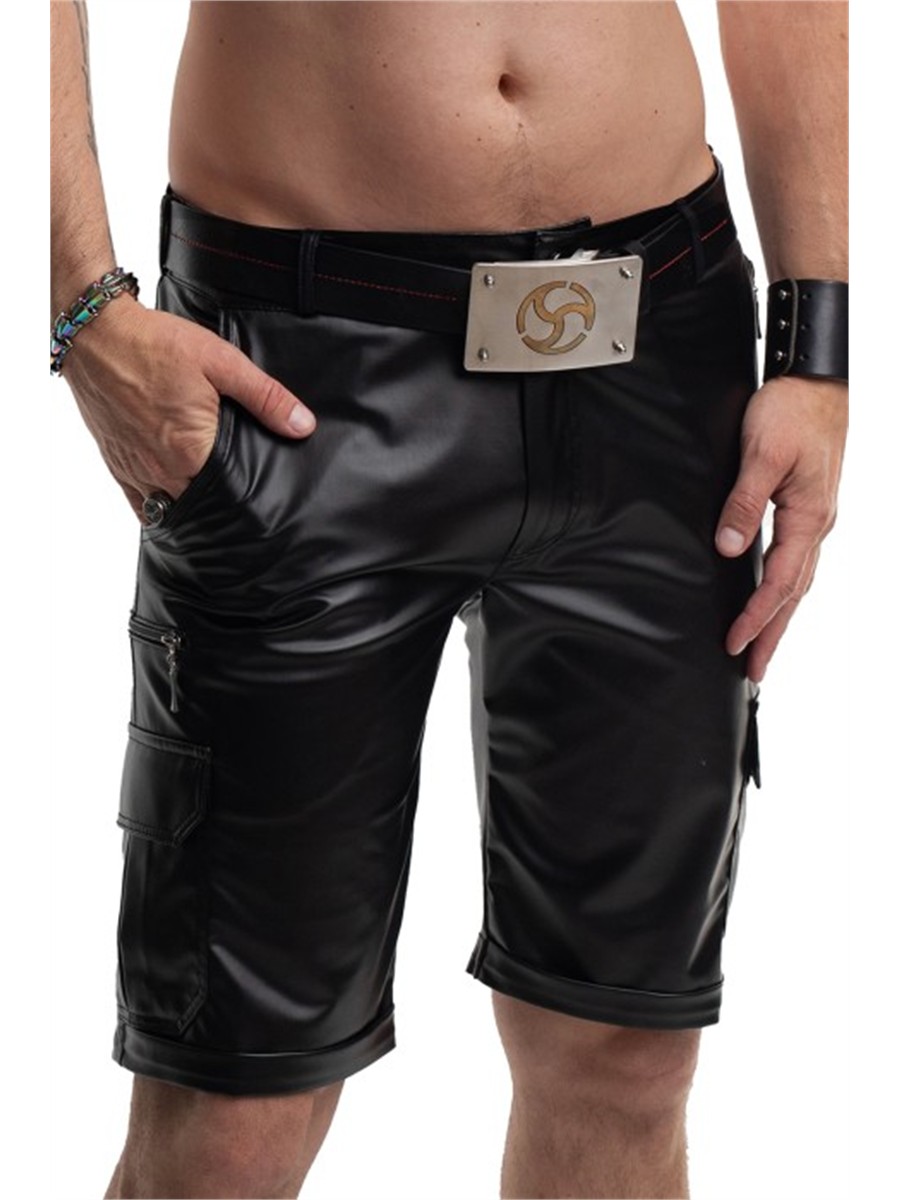 Auffällige Low-Waist-Herren-Cargo-Shorts aus schwarzem, elastischem Wet-Look-Material mit leicht lockerer Passform an Hüfte und Oberschenkeln. Das Modell kombiniert hohe Funktionalität mit einem markanten, maskulinen Design.