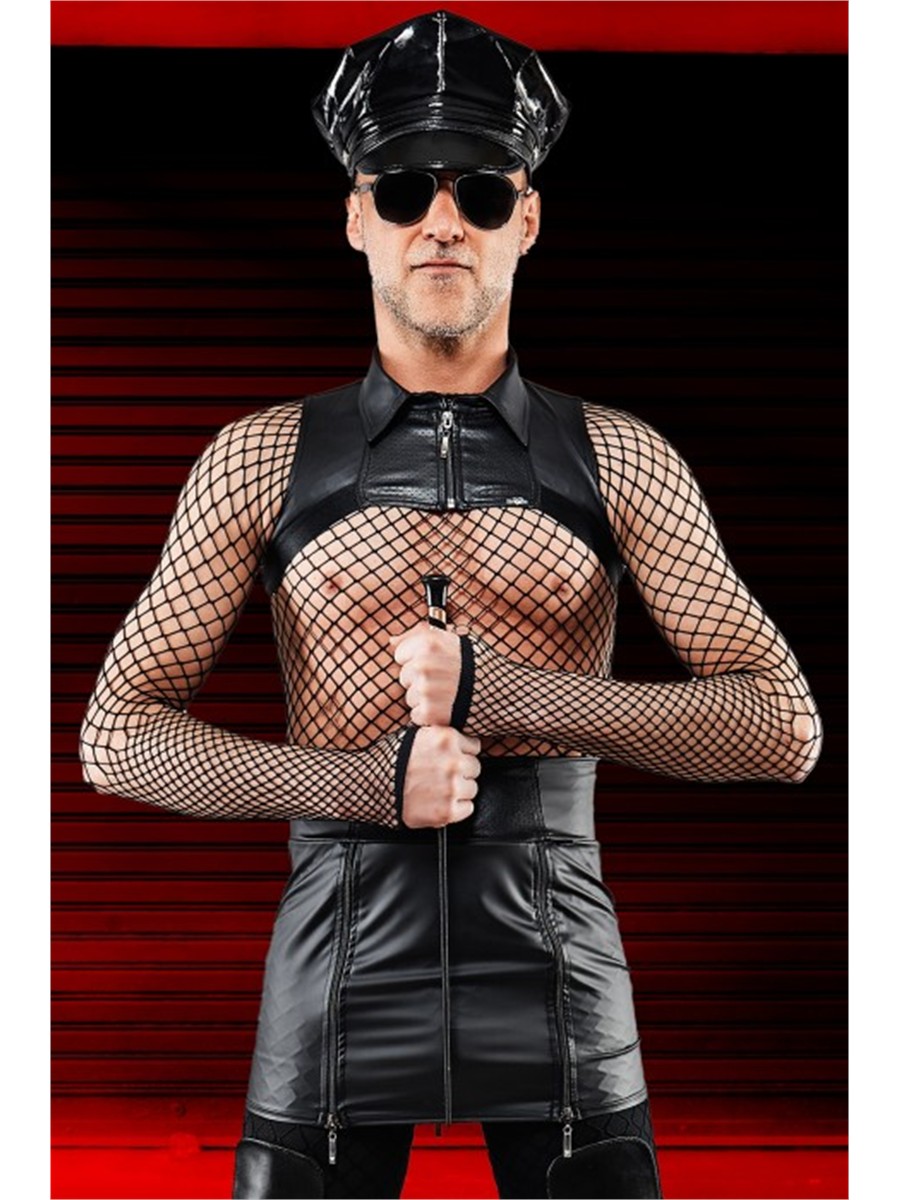 Figurbetonter Herrenrock aus schwarzem 360°-Wet-Look-Material mit funktionalen Reißverschlussdetails. Das elastische Material sorgt für eine körpernahe Passform und betont die Silhouette.