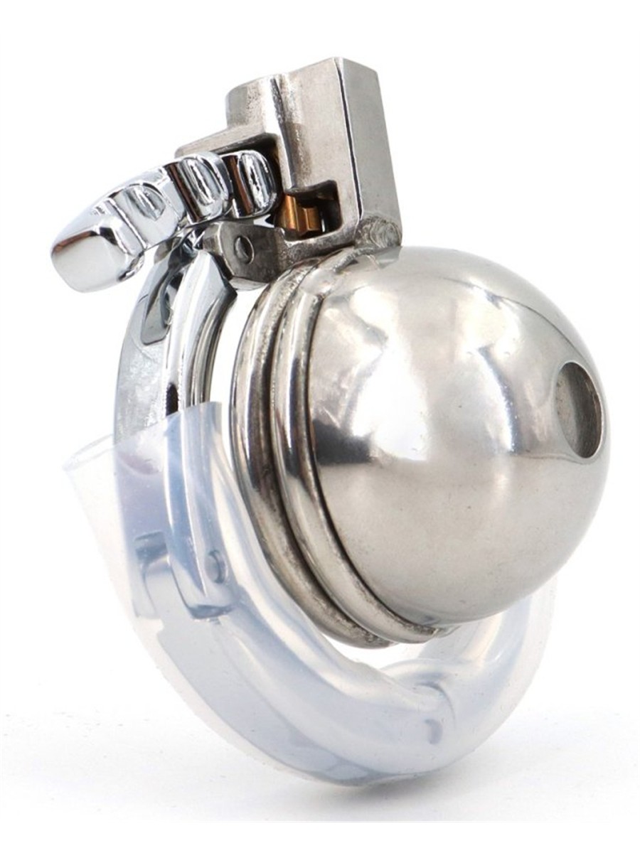 Mit einer Innenlänge von 4 cm und einem Innendurchmesser von 3,3 cm bietet dieser Keuschheitskäfig eine besonders restriktive Passform. Die gewölbte Vorderseite umschließt die Eichel, während eine Öffnung an der Spitze das Abfließen von Flüssigkeiten ermöglicht. Der klappbare Basisring im Akkordeonstil lässt sich flexibel einstellen und deckt einen Durchmesserbereich von 40 mm bis 60 mm ab. Er wird mit einem abnehmbaren Schloss mit zwei Schlüsseln verschlossen.