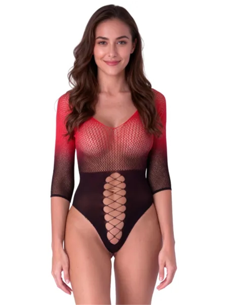 Der Bodystocking Tiffany zeichnet sich durch einen fliessenden Farbverlauf aus, der von einem tiefen Schwarz in ein kräftiges Rot übergeht. Das feinmaschige Netzmaterial ist hochflexibel und passt sich der individuellen Körperform nahtlos an, was einen uneingeschränkten Tragekomfort garantiert. Im Zentrum des Designs stehen die symmetrischen Aussparungen an der Vorder- und Rückseite, die durch eine filigrane Struktur in Schnüroptik verbunden sind. Diese Details betonen die Taille und die Rückenpartie gezielt. Die Kombination aus Dreiviertelärmeln und einem tiefen V-Ausschnitt sorgt für eine harmonische optische Balance. Dank der hochwertigen Verarbeitung aus europäischer Produktion bietet das Material ein angenehmes Gefühl auf der Haut und behält auch bei intensiver Nutzung seine Passform und Elastizität.