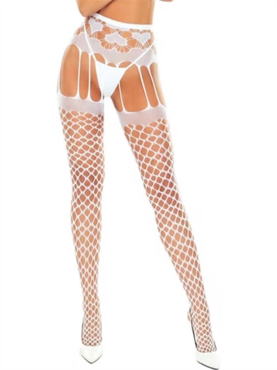 - Kombination aus Netzstrumpfhose und Strumpfhalter-Optik