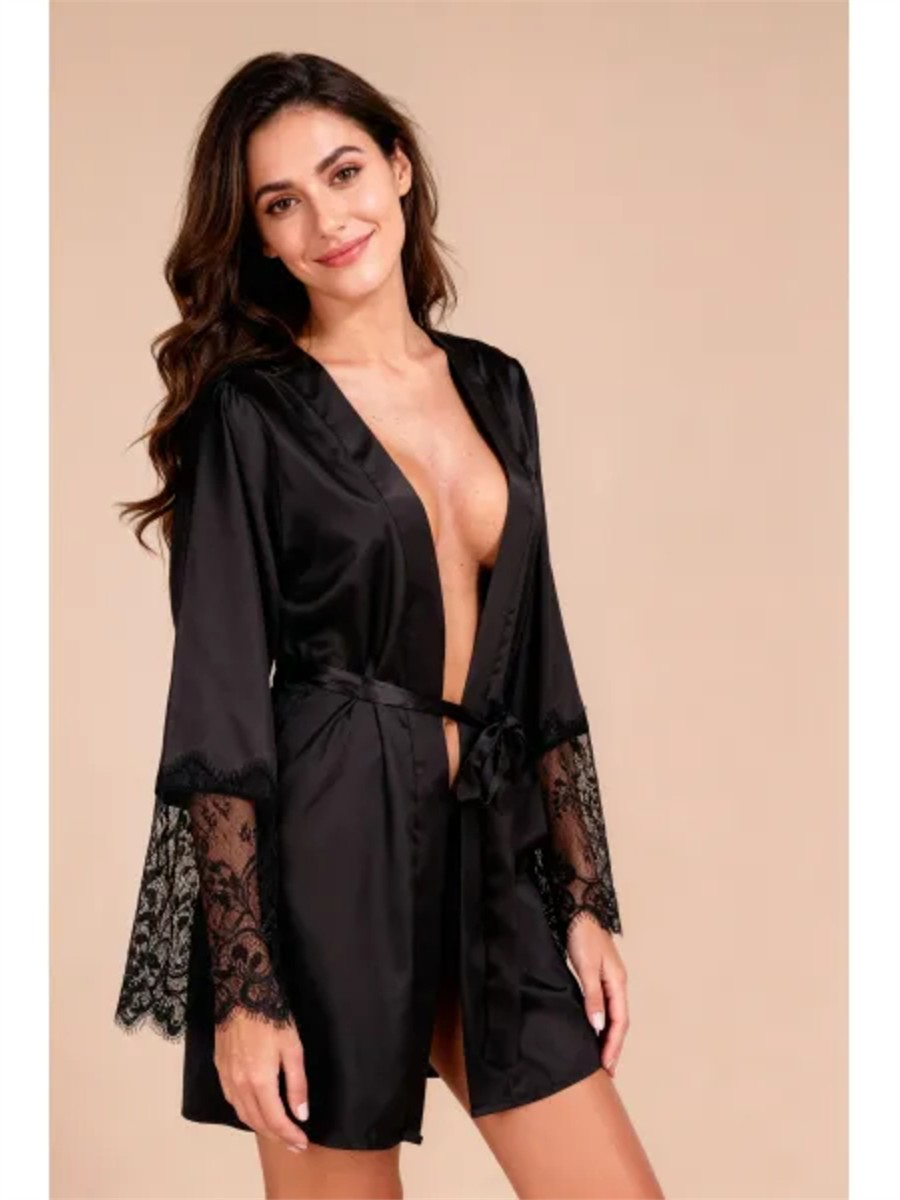 Der Dalhi Peignoir kombiniert die glatte Textur von Satin mit der detailreichen Optik floraler Spitze. Das fliessende Material sorgt für ein angenehmes Tragegefühl auf der Haut, während der grosszügige Spitzeneinsatz am Rücken die Silhouette dezent betont. Die weit ausgestellten Ärmel mit Spitzenabschluss und der integrierte Bindegürtel aus Satin verleihen dem Kleidungsstück eine klassische Eleganz. Ergänzt wird das Set durch einen passenden schwarzen Slip, der das Gesamtbild vervollständigt. Die hochwertige Verarbeitung und die Materialzusammensetzung gewährleisten eine langlebige Formstabilität und ein luxuriöses Erscheinungsbild.