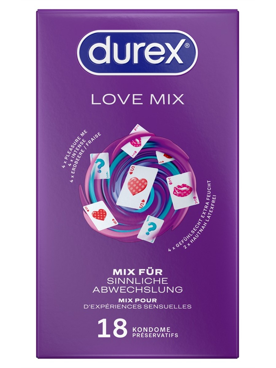 Diese Vorratspackung Love Mix enthält 18 Durex-Kondome in der altbekannten, besten Qualität und in 5 verschiedenen, spannenden Sorten: