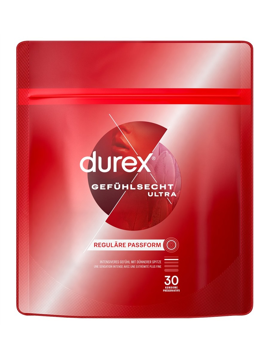 Transparent-Kondome Durex Gefühlsecht Ultra aus Naturkautschuklatex mit 20% dünnerem Material an der Spitze für besonders intensives Empfinden. Mit Reservoir und Feuchtbeschichtung auf Silikonbasis. 205 mm lang, nominale Breite 54 mm.