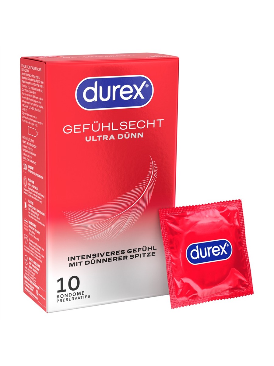 Transparente Kondome Gefühlsecht Ultra dünn von Durex mit dünnerer Spitze für ein intensiveres Gefühl. In gerader Form mit Reservoir. Mit Silikongleitgel befeuchtet.