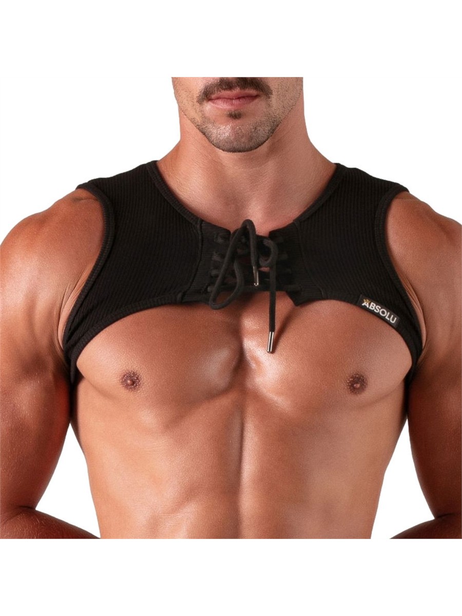 Der Laced Harness von Absolu Male verbindet markante Ästhetik mit hohem Tragekomfort. Gefertigt aus hochwertigem, geripptem Baumwollgewebe, verleiht das Material dem Oberteil eine zeitlose Retro-Optik. Die markante Schnürung an der Vorderseite dient nicht nur als optisches Highlight, sondern ermöglicht eine individuelle Anpassung an den Oberkörper. Durch die flexiblen Bänder lässt sich der Harness vollständig öffnen und variabel schliessen. Ein dezentes Detail im Inneren bietet Platz für kleine Utensilien. Die Kombination aus natürlicher Baumwolle und einem Anteil an Elasthan sorgt für eine körperbetonte Passform, die jede Bewegung mitmacht und die Brustmuskulatur wirkungsvoll betont.