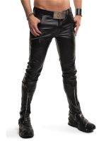 Auffällige Low-Waist-Herrenhose aus schwarzem, elastischem Wet-Look-Material. Dekorative Reißverschlüsse an den Oberschenkeln verleihen dem Modell eine markante, moderne Optik und zusätzliche Funktionalität.