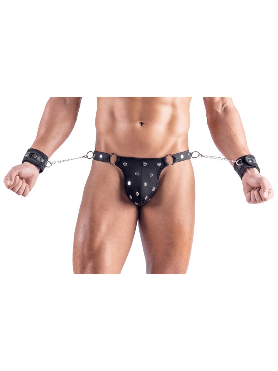 Schwarzer Riostring von Svenjoyment Bondage inklusive Soft-Handfesseln. Im Mattlook mit silberfarbenen Metall-Accessoires. Weich und elastisch für besten Tragekomfort. Rio in der Front mit dekorativen Nieten bestückt. Bund vorne sowie seitlich mit Ringen, an denen die beiliegenden Handfesseln mit ihren Karabinerketten schnell eingehakt sind. Die soften Mattlook-Manschetten sind mit Klettverschlüssen schnell angelegt und angepasst.