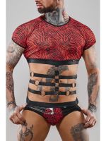 Brasilianische Art Slip. Ganz aus elastischem und dehnbarem Tüll in der Farbe schwarz und rot Zebra. An der Taille, schwarz, breit und schön zu berühren Gummiband. Vorne unter dem Tüll ein Einsatz aus schwarzem, glänzendem Vinyl. Dadurch entsteht der Effekt einer optischen Vergrößerung und ein spektakulärer Look.