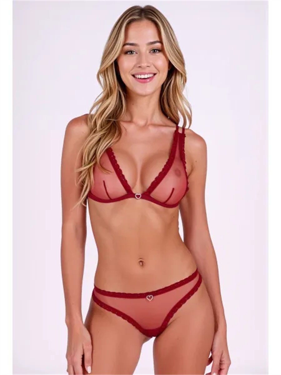 Ein transparentes Dessous-Set aus feinem Polyamidmesh in intensivem Burgunderrot. Der Soft-BH besitzt ungepolsterte Cups, schmale Spitzenabschl