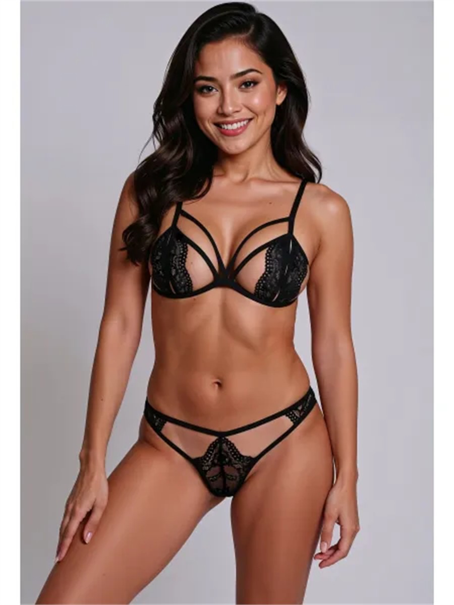 Ein sinnliches Dessous-Set aus feiner, transparenter Spitze in klassischem Schwarz. Der BH besitzt dekorative Strap-Details, die das Dekollet