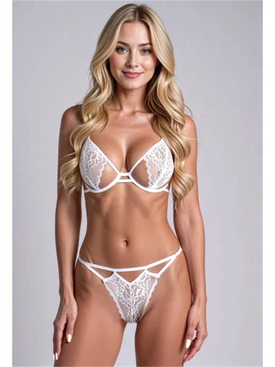 Ein modernes Dessous-Set aus feiner, transparenter Spitze in reinem Wei