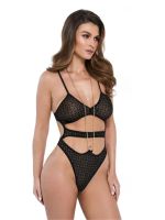 Das Set Klara besticht durch eine harmonische Verbindung von Transparenz und glanzvollen Akzenten. Das zweiteilige Ensemble aus feinem, schwarzem Netzgewebe ist flächendeckend mit silbernen "Strasssteinen" besetzt, die das Licht bei jeder Bewegung reflektieren und für eine exklusive Optik sorgen. Das bauchfreie Oberteil mit hochgeschlossenem Kragen setzt die Halspartie und das Dekolleté wirkungsvoll in Szene, während das passende Höschen durch seinen Schnitt die Taille und Hüftkurve betont. Durch die hohe Elastizität des Materials schmiegt sich das Gewebe den individuellen Körperkonturen an und bietet einen sicheren sowie komfortablen Sitz auf der Haut.