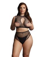 Hochgeschlossenes Minikleid aus Netzstoff und Lattenzaunnetz. Mit undurchsichtigem Halsband, kann mit offenen Cups und bedeckt getragen werden. Die blickdichte V-Linie betont die Taille. Das weiche, superdehnbare Material passt den Größen XL bis 4XL.