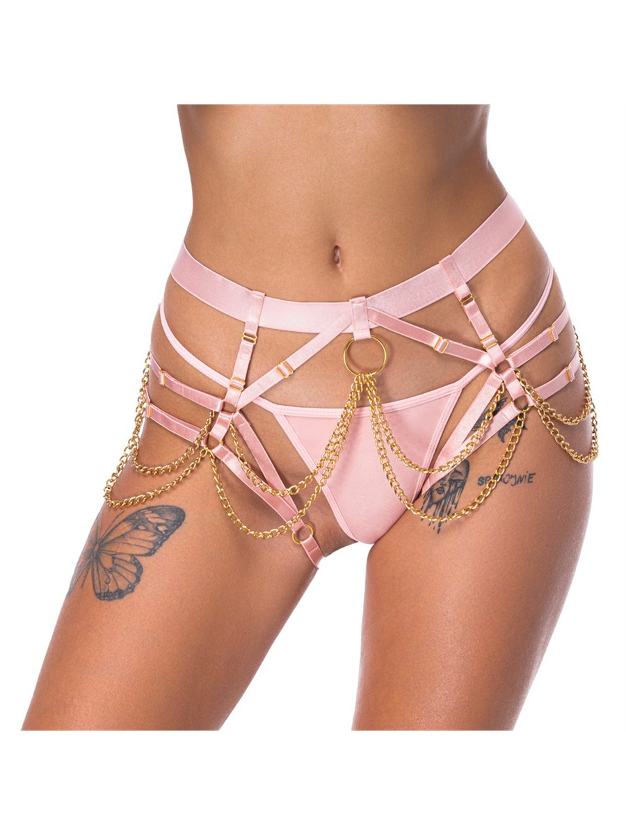 Extravaganter Harness-String von Bad Kitty inklusive Mini-String. Harness-String aus roséfarbenen, edel schimmernden Stretchriemen mit goldfarbenen Accessoires. Zusätzlich mit schwingenden Ketten vorne und seitlich glamourös in Szene gesetzt. Die weichen, elastischen Riemen und der breitere Taillengurt sind vielfach verstellbar für perfekten passenden Sitz. Ein roséfarbener Ministring ist inklusive für den weniger freizügigen Look.