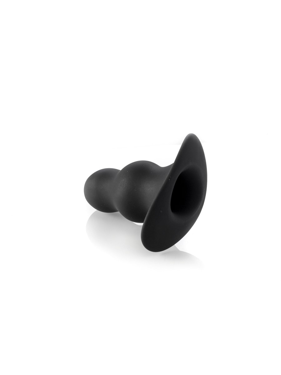 Glatter, schwarzer Tunnel Plug mit einer Gesamtlänge von 95 mm und zwei unterschiedlich großen Wölbungen. Die erste Wölbung hat einen maximalen Durchmesser von 34 mm, die zweite hat 46 mm. Die schmalere Stelle zwischen den Wölbungen hat einen Durchmesser von 31 mm und bietet beim Einführen eine erste Gelegenheit für eine Pause, bevor der Rest hineingeschoben wird. Dadurch, dass der Tunnel Plug innen hohl ist, kann jede Art von Flüssigkeit hineingeschüttet (oder gepisst) werden. Lassen Sie Ihrer Fantasie freien Lauf!