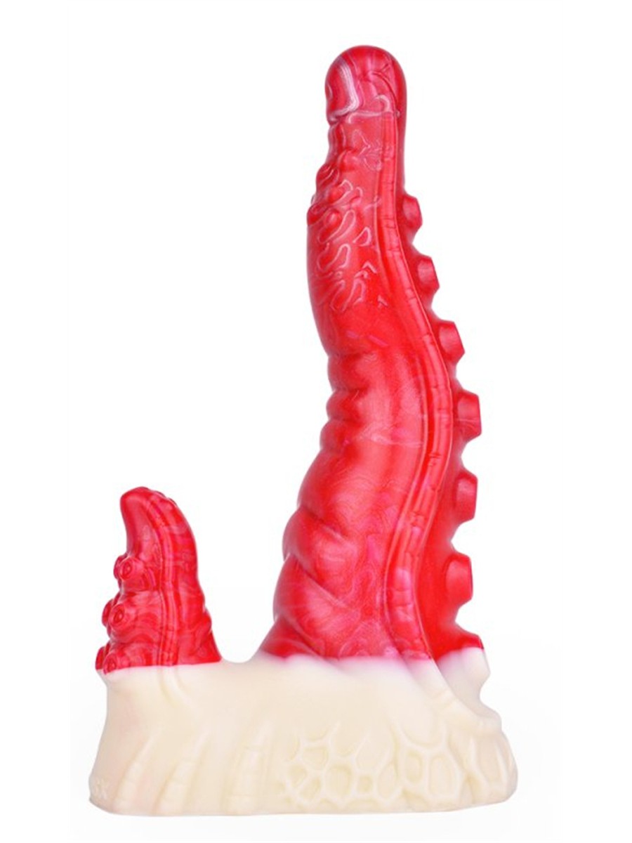 Der größere Tentakel besitzt eine leicht gebogene, konische Silhouette mit markanten Saugnapfstrukturen, die gezielt Druckpunkte an den empfindlichsten Stellen setzen. Der kleinere Tentakel dient als zusätzliche perineale oder externe Stimulation, wodurch das Toy ein vielseitiges Werkzeug für experimentelle und fantasievolle Spiele wird.