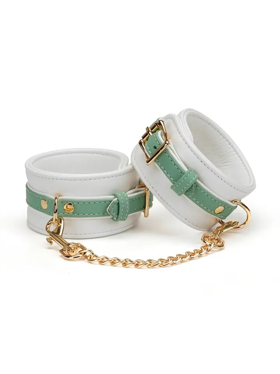 Diese eleganten Handschellen verbinden einen zarten Look mit hochwertiger Handwerkskunst. Die schneeweiße Basis wird stilvoll durch mintgrüne Lederdetails und goldfarbene Metallelemente akzentuiert. Das Design ist sowohl verspielt als auch elegant und eignet sich ideal für sinnliche Momente mit einem Hauch von Leichtigkeit. Die Handschellen sind aus weichem Premium-Lammleder gefertigt, angenehm zu tragen und bieten einen sicheren Halt.