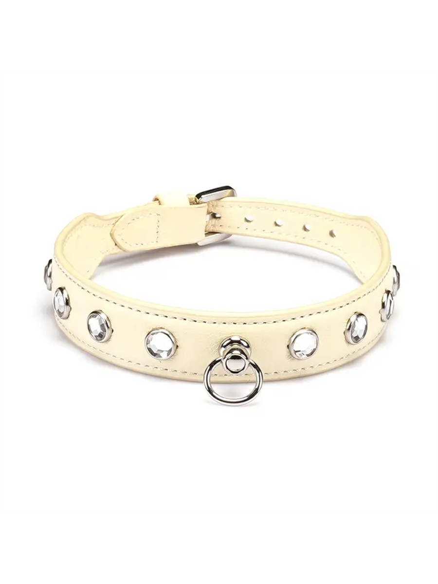 Dieses stilvolle Lederhalsband kombiniert den aktuellen Dopamin-Modetrend mit einem klaren, eleganten Design. Die strahlend weisse Farbe in Kombination mit funkelnden "Strasssteinen" sorgt für einen auffälligen Look, der sowohl als Modeaccessoire im Alltag als auch in intimen Momenten getragen werden kann. Die hochwertige Verarbeitung verleiht dem Halsband einen modernen, raffinierten und vielseitigen Look.