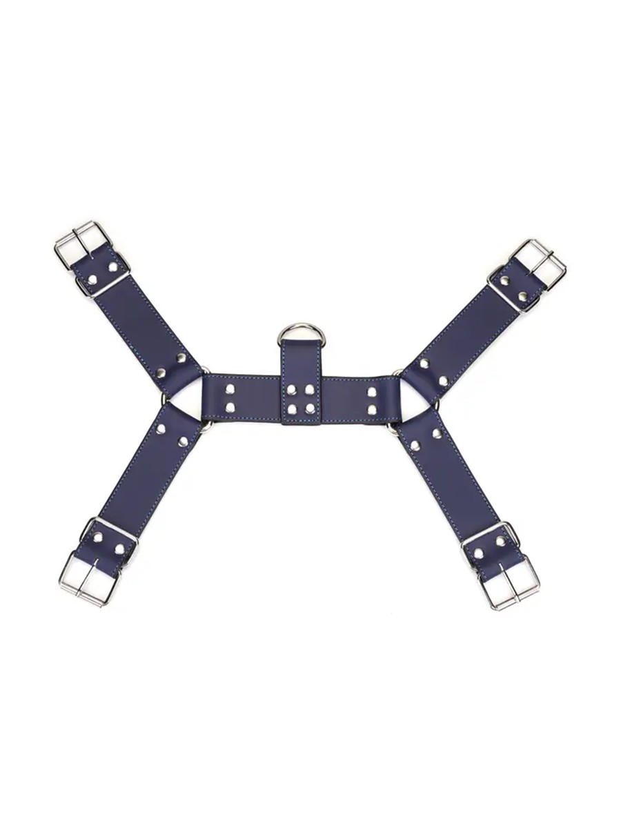 Dieses Ledergeschirr kombiniert ein klares Design mit einer funktionalen Passform. Das blaue Rindsleder wird durch silberfarbene Metallelemente ergänzt und sorgt für einen markanten, maskulinen Look. Die verstellbaren Riemen ermöglichen eine individuelle Anpassung und einen sicheren Sitz. Geeignet für kontrollierte Rollenspiele und als auffälliges Accessoire.