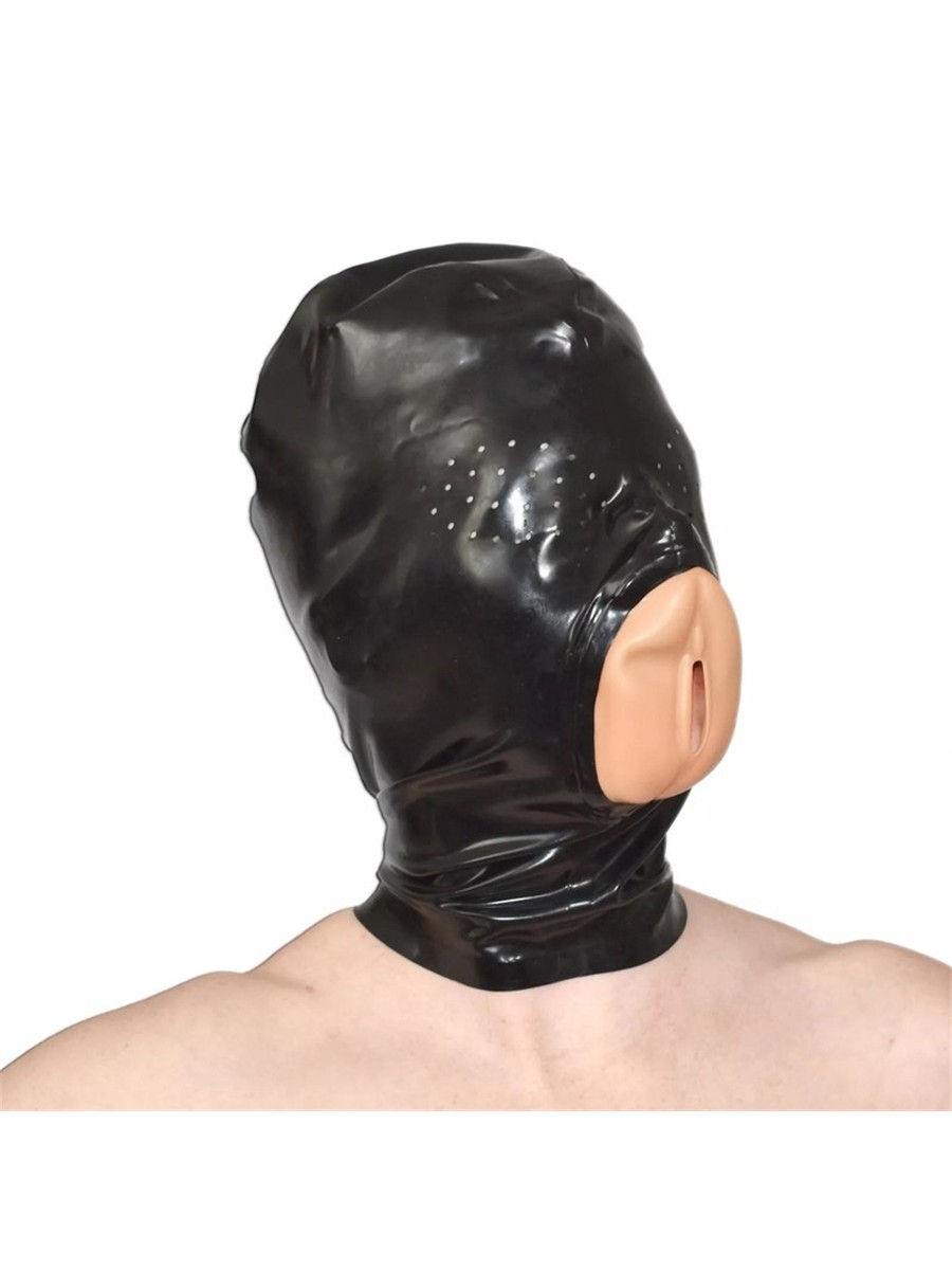 Die schwarze Haube aus glattem Naturlatex umschließt den Kopf vollständig und setzt mit ihrer realistisch gestalteten Vulvaform im Mundbereich einen klaren, provokanten Akzent. Entwickelt für BDSM- und Fetischspiele, verbindet diese Maske einen auffälligen Look mit funktionalem Design und hohem Tragekomfort.